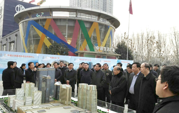 从2014年12月23日起,由邯郸市委书记高宏志,市委副书记、代市长王会勇等市四大班子领导带队,深入各县(市、区)就重点项目建设情况进行集中观摩,习惯上被称作年终“大考”,备受重视。市领导第一站就来到中道公司,认真听取了董事长王孟堂的汇报,详细观看了项目建设情况图板,引起了浓厚兴趣,给予了充分肯定。市领导此行使在场公司领导深受触动,得到启发,感受到了不进则退的压力,表示要以这次集中观摩为契机,按照市委八届六次全会决策部署,进一步解放思想,加压奋进,一如既往、全力以赴地谋划好公司所有在建项目,力争“大考”之后向市领导交出一份满意“答卷”,为建设富强邯郸、美丽邯郸献智出力。上图前排右数第二人起分别为市委副书记、代市长王会勇,中道公司董事长王孟堂,市委书记高宏志。