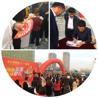7日下午,中道南广场成了欢乐的海洋,大型红色拱门矗立在广场中央,“北方装饰城”巨大的标牌格外醒目。临时搭建的舞台上,节目主持人妙语连珠,暖场的演员纵情歌唱、舞蹈,魔术师戏法变化莫测,妙趣横生,精彩的表演赢得了台下观众的阵阵掌声和欢呼声,整个现场喜庆氛围热烈、浓厚。舞台背景“北方装饰城十一钜惠购物砸金蛋 微信转发领礼品”的巨幅广告引人注目。舞台前方摆放的金蛋更是人们用情关注的焦点。