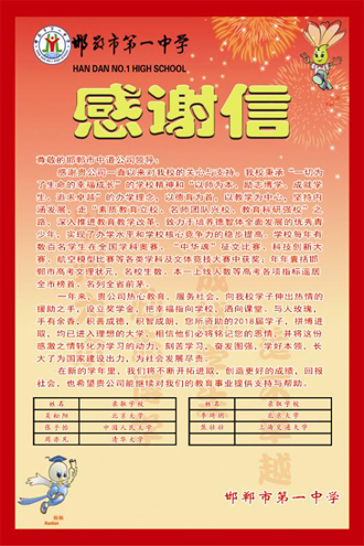 2019年春节前夕,中道公司收到了来自邯郸市第一中学的感谢信,全文如下: